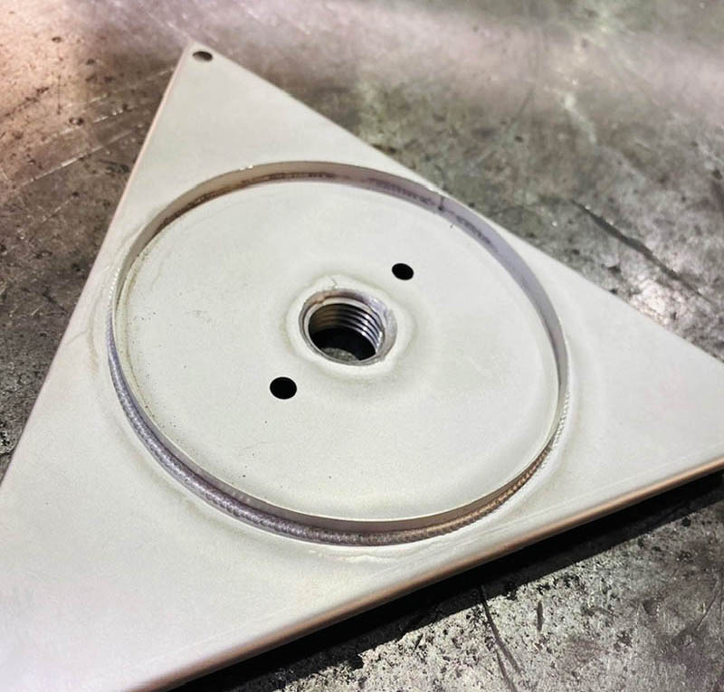 三角部分の板厚はt1.0 丸の帯状の部分はt0.5になります。 本来加工難とされる超薄板で、YAG溶接・ファイバーレーザー溶接でしか出来ないと言われていますが、TIG溶接での施工指示がありました。 理由は、溶接部が溶け込みを広く深くさせて欲しいとの事で、TIG溶接が必須でした。 YAG溶接・ファイバーレーザー溶接は溶け込みが中~深く溶接が出来ますが、溶接ビート「横幅」範囲が狭い為、TIG溶接での施工に至りました。 本製品のTIG溶接では、溶け込みが深く熱影響が大きいので薄板溶接では歪みや穴が開いてしまうリスクがあるのですが、弊社独自の技術で歪みにくい様に溶接部の裏に銅板を,挟み熱挟み、熱を逃がす考慮を実施しました。 その他で言えば溶接中にも熱がこもるので、水やエアーでの冷却を怠らず製品を完成させました。