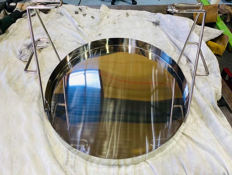 SUS304 t1.5の品物で丸い部分の底板が裏表フル溶接の案件で、底部平行度±1以内でした。 見た目とは異なる、簡単そうに見えて難しい品物です。 歪んで底部が太鼓状に膨らむ歪みが生じます。 当時依頼があったとき、ファイバーレーザー溶接が弊社には無くTig溶接での製作になり、板厚が薄いため熱の膨張・冷えた時の伸縮など全てを加味した上で溶接しないと綺麗に仕上がらないので製作難案件でしたが 、溶接順・熱管理を考慮しながら溶接付近を素手で熱を与えるなどして製作いきました。 基本弊社は薄板や化粧物の板を抑え込みません。理由は薄板なのでシワが入ったりするからです。 歪み・捻りが出ると加味した上で板本来の材質の癖を見抜き製作に取り掛かっております。