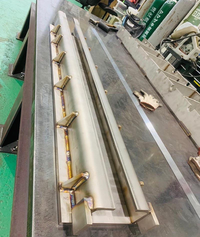 火も取り扱うため溶接強度必須の外側フル溶接になります。 板厚はt22で、板厚が厚くなればなるほど歪みの修正も困難になるのですが、逆歪も使わず、溶接順にて歪み矯正しながら溶接しました。 そうすることで後から手直しもしなくて済むので傷・修正の跡もなく完成することが出来ております。