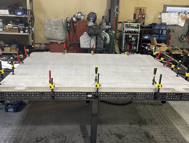 SUS304 t3の品物で、製作上歪みが出ることを加味した上で当初t4指示での依頼でしたが、先方がコストダウンも図りたいとのことでしたのでt3にて製作致しました。 真空装置に熱が帯びるという事で、2重ジャケットで中に断熱材が入る扉になり、後から追加で取り付けたいとの製作でした。 既存の真空装置に取り付ける際に、相手方が機械加工面になっており、反り・歪みは絶対のタブーです。 横1600縦2700の大型板金製品で、漏れ無き事との条件付きのフル溶接案件でしたので、かなりの製作難になりました。 平行度指示は±0.5になります。 ですが弊社設備の3D定盤にて固定し、ファイバーレーザー溶接による技法とノウハウの融合で、低歪溶接が可能になり、板厚を落としコストダウンを図ることが出来、尚且つ平行度公差も0にて製作することが出来ました。 実際装置に取り付けた中で、寸分の狂い無く製作出来ていなければ製品としての能力を発揮できなかったみたいです。