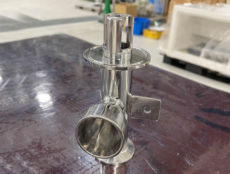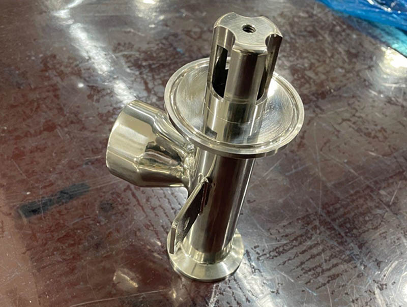 外側にヘルールとエルボがついて真ん中のねじ部分の機械加工品を溶接して取り付けています。 エルボは既製品を使用しているため、寸法 角度が出ておらず、それを加味し何回も確認しながら製作にあたりました。 上記条件を含め、寸法公差・美観を意識した仕上がりになっています。