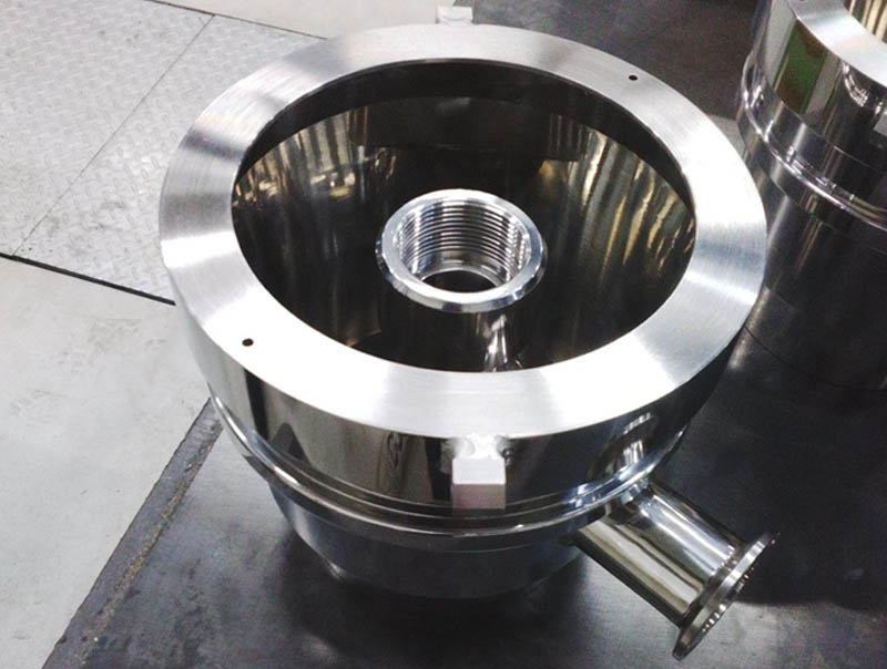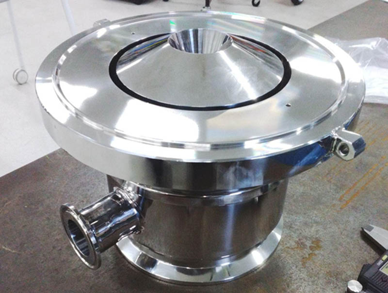 粉体機器は表面を研磨でツルツルにすることで粉を流れやすくするため全て研磨品になります。 装置の連結部に取り付き、製作精度を出さないと接地面などから粉が漏れる恐れがあります。 サイズ感で言えば手のひらサイズですが、小さすぎると溶接後の歪みも治りにくいのが現実です。 「小さい=凝縮していて硬い」イメージです。 ですがあらかじめ歪みを予想し矯正しながら製作に挑んでいますので精度を出すことが出来ております。